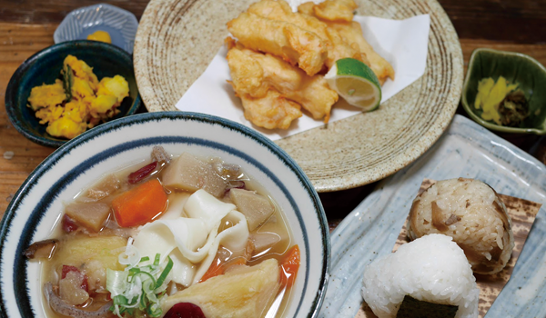 白おにぎり/かしわおにぎり/唐揚げ、とり天/季節の小鉢/出汁巻き玉子/野菜天ぷら/だご汁/柚子胡椒/本日の漬物